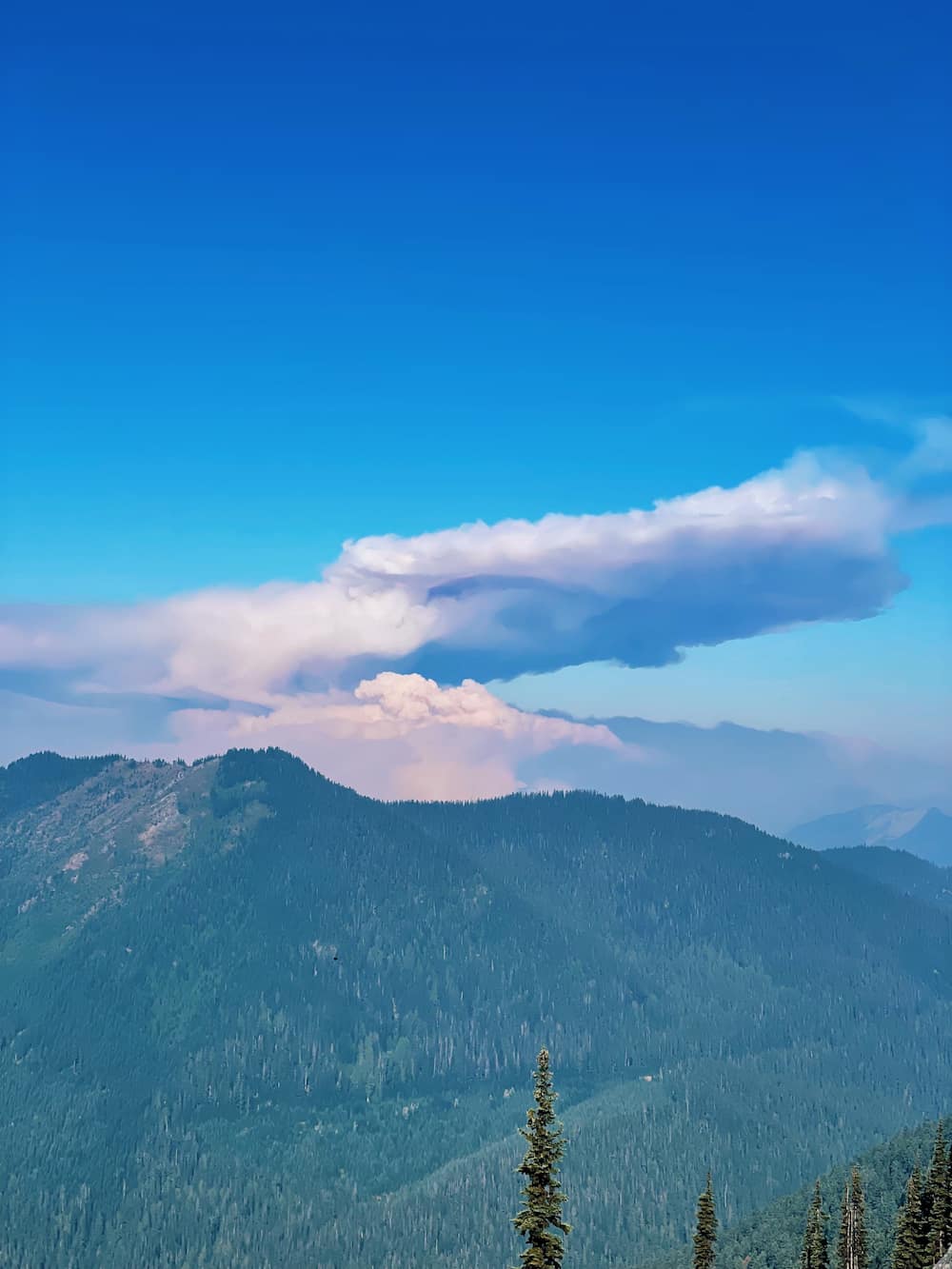 One September morning, we woke to thick smoke from the Wenatchee fire. Later that day, climbing Piper Pass, I saw what looked like a nuclear explosion on the horizon. With no news yet about this new fire, I pushed on for 18 miles. When I finally reached a ski resort, I learned that the entire area had been evacuated and the highway was shut down.