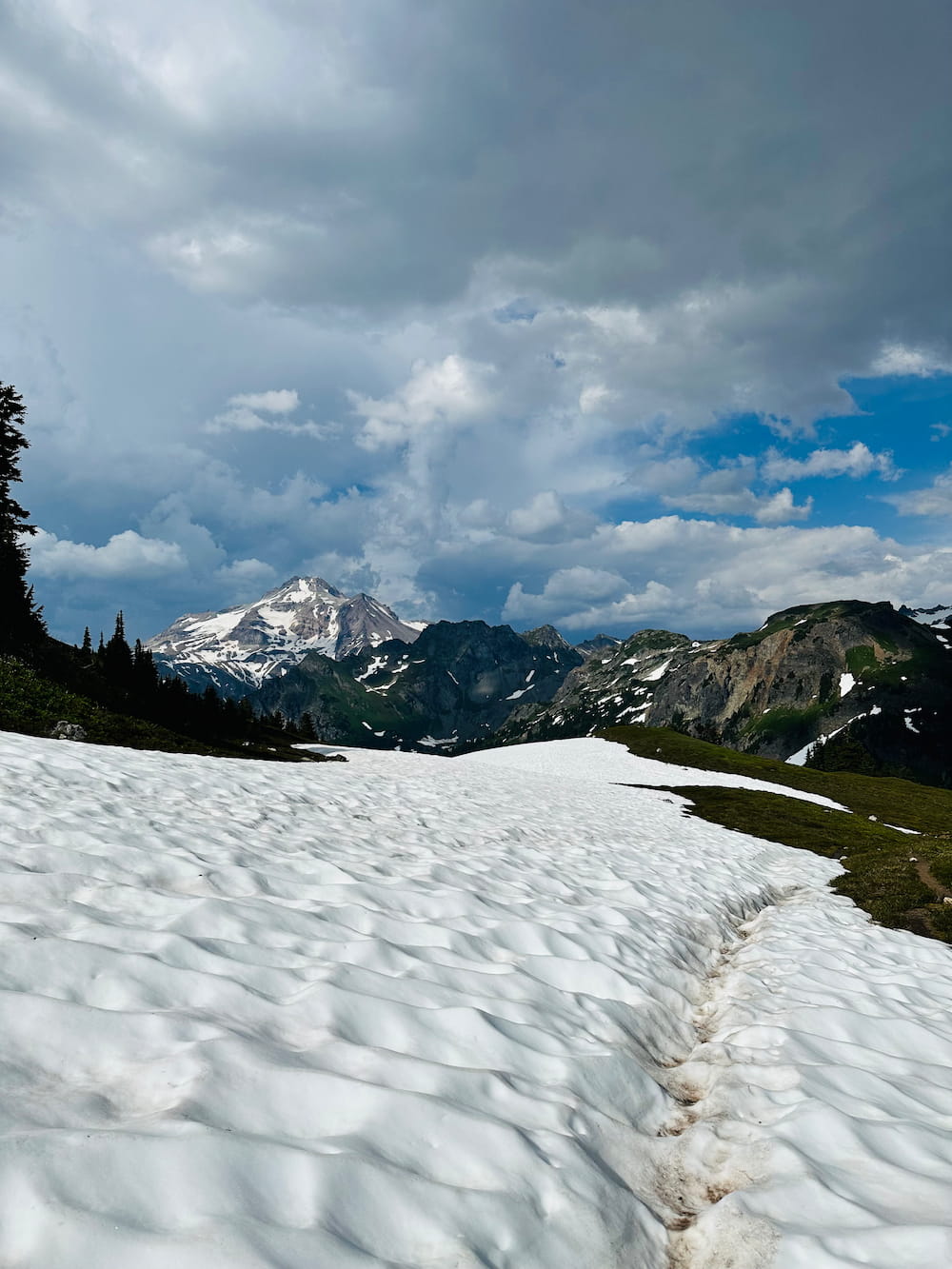 I deliberately avoided researching the last 180 miles. On July 3rd, I boarded a bus in Seattle to Stevens Pass—the same spot I’d hitched out from 10 months earlier—and picked up right where I’d left off. And oh, it felt good to be back. The trail didn’t make it easy. There were endless blowdowns, swarms of mosquitoes, washed-out paths, and glacier-fed streams I had to cross alone—despite fast-moving water being one of my biggest fears. At one point, I slipped on a snow-covered slope and had to self-arrest by grabbing the nearest bush.